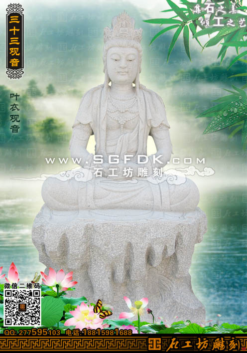 楊柳觀音:觀世音菩薩三十三相之首尊,又名「藥王觀音」。其像踞坐于巖上,右手持楊柳,或身旁放楊柳淨瓶,表示千手觀音之楊柳手三昧。