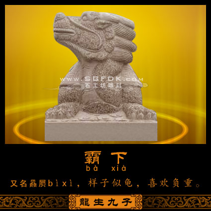 老大贔屭(bì'xì),形似烏龜,是長壽和吉祥的象徵,喜好背重物,搬的越重就越有成就感。臺(tái)南赤崁樓前,陳列的九座高大的乾隆年間雕造的「石龜御碑贔」底下貌似龜?shù)牡k,其實(shí)就是龍王的大力士長子呢!