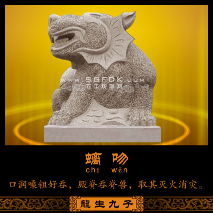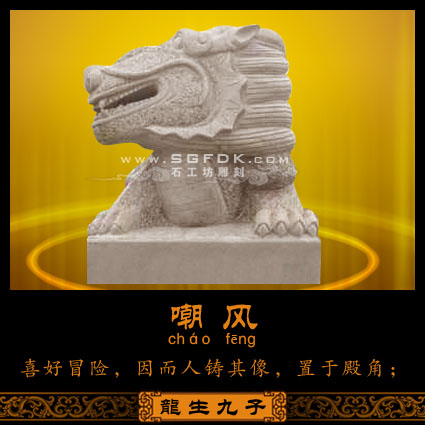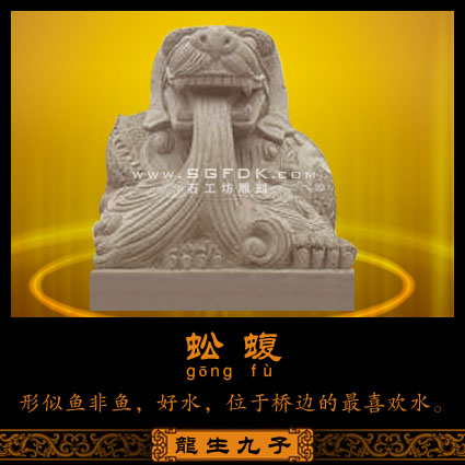 老六蚣蝮(gōng'fù),性喜水,傳說是龍王最喜歡的兒子,因?yàn)榈k長的最像龍王,蚣蝮喜歡玩水,所以常立于河邊,雕成橋柱或是建筑上滴水的獸形。