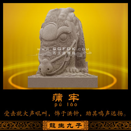 老三蒲牢(pú'láo),形體似龍而體積較小,性好鳴叫,傳說蒲牢害怕鯨魚,所以在廟裡可以看到擊鐘的槌會(huì)刻化成鯨魚的形狀,而祂就是鐘上的獸鈕,要想鐘聲宏亮,「鯨擊蒲牢」便會(huì)發(fā)出很大的鳴叫聲。