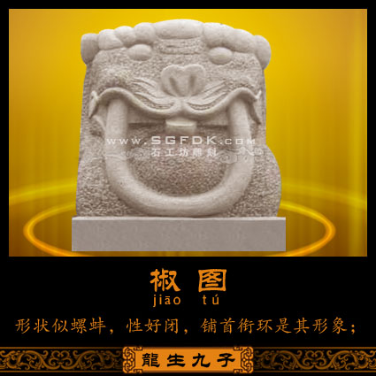 老九椒圖(jiāo'tú),性好閉,形狀像螺蚌,跟螺蚌一樣好閉,遇到危險(xiǎn)總是會(huì)將殼口緊閉,以防遭受到威脅,也因?yàn)檫@種特性,常在大門上可以發(fā)現(xiàn)到祂們的蹤影,意味著緊閉之意,以求安全。