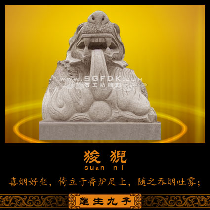 老八狻猊(suān'ní),形體似獅,喜歡香煙繚繞之處,常雕琢成香爐腳,可在廟宇的寺廟香爐旁發(fā)現(xiàn)祂的身影,正隨之吞煙吐霧。