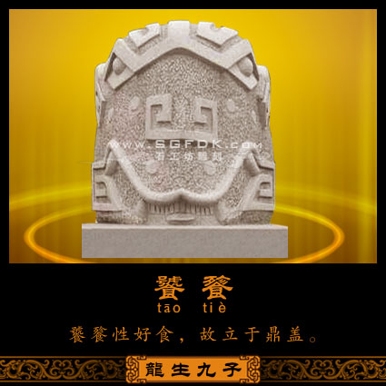 老五饕餮(tāo'tiè),好飲食,所以常立于鼎蓋,圖案化的獸面紋飾出現(xiàn)在商周青銅器上,稱作饕餮文,是中國古代銅器最重要的裝飾圖案。傳說饕餮是一種兇惡貪食的野獸,所以后代人們便將貪婪財(cái)物的人隱喻為饕餮之徒。