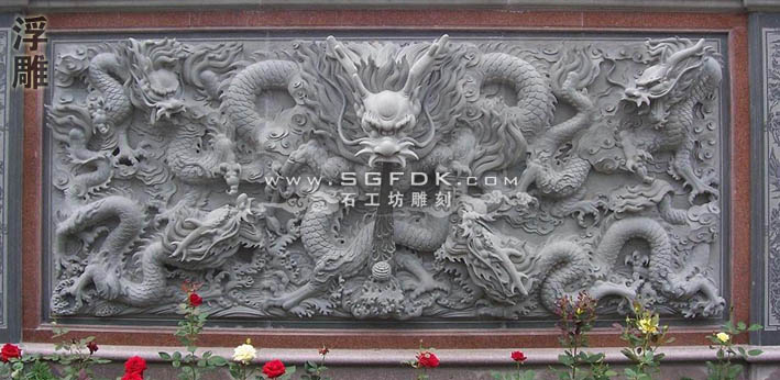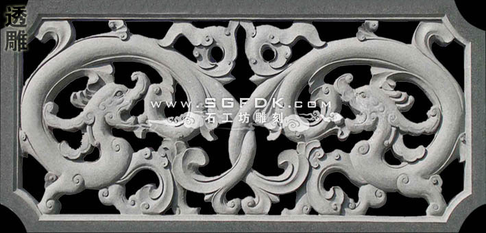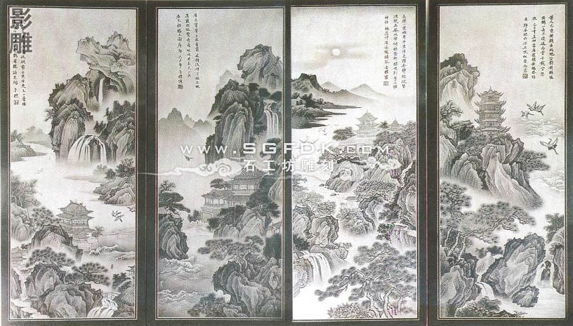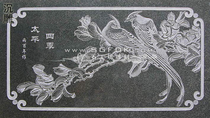 3、沉雕:又稱"線雕",即采用"水磨沉花"雕法的藝術(shù)品。此類雕法吸收中國畫與意、重疊、線條造型散點透視等傳統(tǒng)筆法,石料經(jīng)平面加工拋光后,描摹圖案文字,然后依圖刻上線條,以線條粗細深淺程度,利用陰影體現(xiàn)立體感。此類產(chǎn)品多數(shù)用于建筑物的外壁表面裝飾,有較強的藝術(shù)性。