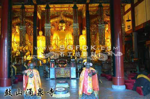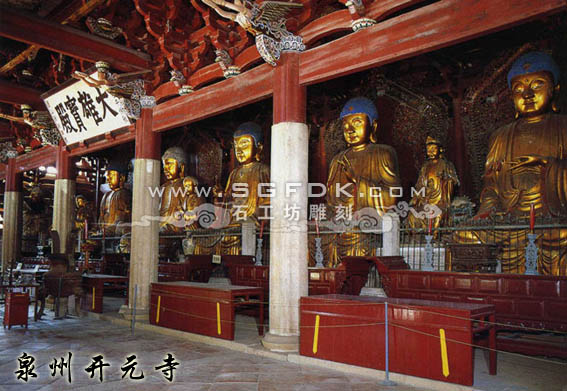 以福建佛寺為例,閩南最大的佛寺泉州開(kāi)元寺其大雄寶殿供的是五方佛,其他的名剎多數(shù)是三世佛或三方佛,如鼓山涌泉寺、福州西禪寺、莆田廣化寺、漳州南山寺、泉州承天寺、安海龍山寺后殿、廈門(mén)南普陀寺等均供奉三世佛。