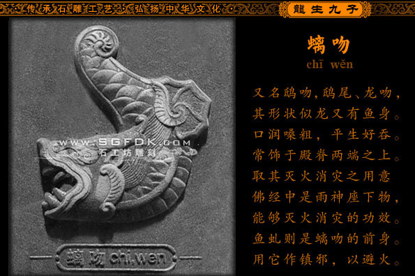 又名鴟吻,鴟尾、龍吻,其形狀似龍又有魚身?跐櫳ご郑生好吞。常飾于殿脊兩端之上。取其滅火消災(zāi)之用意,佛經(jīng)中是雨神座下物,能夠滅火消災(zāi)的功效。魚虬則是螭吻的前身。用它作鎮(zhèn)邪,以避火。做張口吞脊?fàn),并有一劍以固定之?/span>