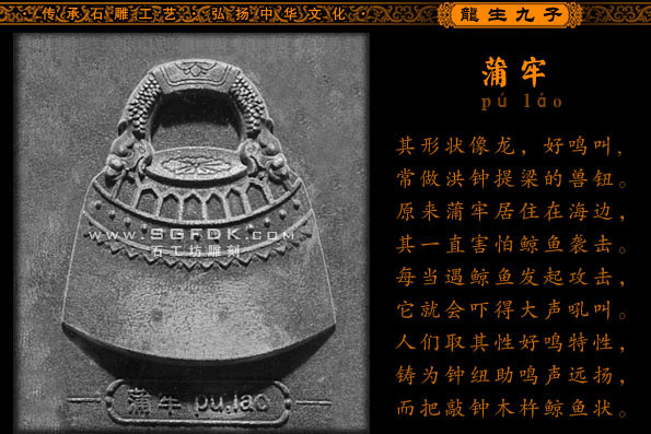 其形狀像龍,好鳴叫,常做洪鐘提梁的獸鈕。原來蒲牢居住在海邊,其一直害怕鯨魚襲擊。每當(dāng)遇鯨魚發(fā)起攻擊,它就會(huì)嚇得大聲吼叫。人們?nèi)∑湫院螟Q特性,鑄為鐘紐助鳴聲遠(yuǎn)揚(yáng),而把敲鐘木杵鯨魚狀。