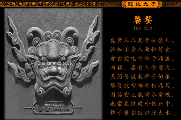 虎齒人爪其音如嬰兒。狀如羊身人面性好食,貪食愛吃常飾于鼎蓋。兇猛,喜食人食量大。民間傳說其樣子似狼,饕餮紋常飾青銅鼎器,因其它也能喝水貪吸,也常在橋梁外側(cè)正中,飾于饕餮紋以防大水.。