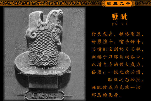 豺頭龍身,性格剛烈,好勇擅斗,嗜殺好斗,其嘴銜寶劍怒目而視,刻鏤于刀環(huán)劍柄吞口,以增自身的強(qiáng)大威力。俗語:一飯之德必償,睚眥之怨必報(bào)。睚眥便成為克煞一切邪惡的化身。