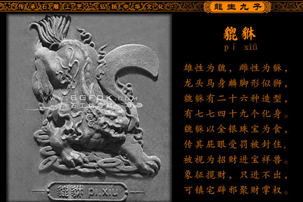 雄性為貔,雌性為貅,龍頭馬身麟腳形似獅,貔貅有二十六種造型,有七七四十九個(gè)化身。貔貅以金銀珠寶為食,傳其屁眼受罰被封住,被視為招財(cái)進(jìn)寶祥獸。象征攬財(cái),只進(jìn)不出,可鎮(zhèn)宅辟邪聚財(cái)掌權(quán)。