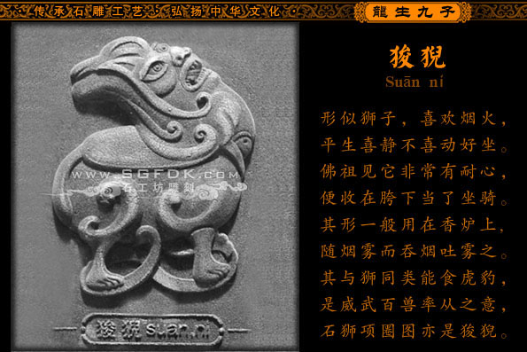 形似獅子,喜歡煙火,平生喜靜不喜動(dòng)好坐。佛祖見它非常有耐心,便收在胯下當(dāng)了坐騎。其形一般用在香爐上,隨煙霧而吞煙吐霧之。其與獅同類能食虎豹,是威武百獸率從之意,石獅項(xiàng)圈圖亦是狻猊。