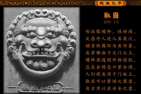 形狀像螺蚌,性好閉。反感外人進(jìn)入其巢穴,鋪首銜圓環(huán)為其形象。其常雕畫于大門之上,螺蚌若遇到外物侵犯,總是會(huì)將殼口緊合閉。人們將其用于門板上,取其可以緊閉之寓意,自古用以求安全之意。