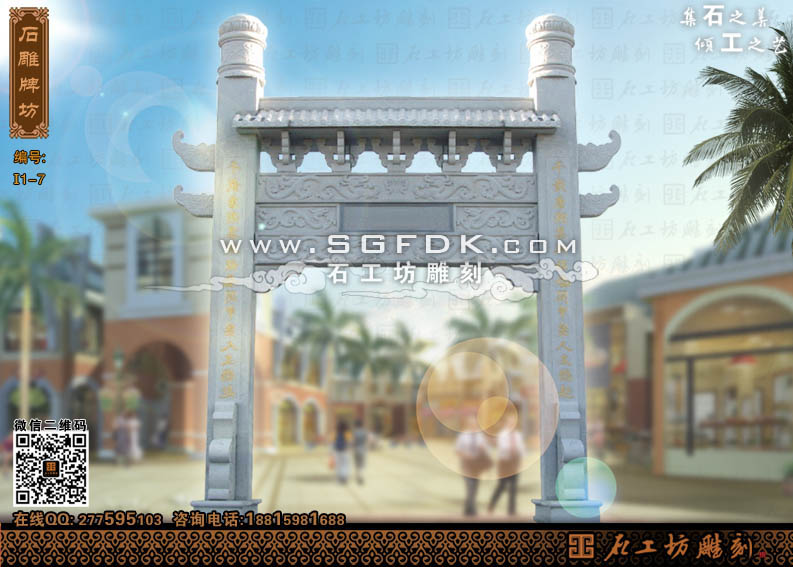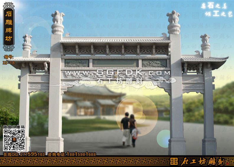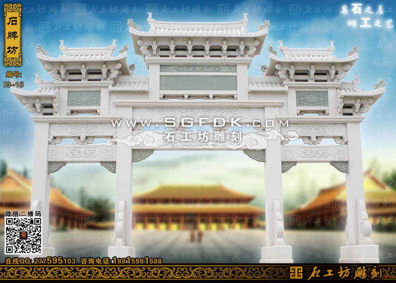 隨著以程朱理學(xué)為代表的封建意識(shí)的普及和深入,明清時(shí)期,牌坊的發(fā)展達(dá)到了鼎盛。其標(biāo)志一是出現(xiàn)了大量多柱、多間、多樓牌坊,二是牌坊開始高密度出現(xiàn),涌現(xiàn)出許多蔚為壯觀的牌坊群、牌坊鄉(xiāng)、牌坊城、牌坊園。(原文出處:石工坊雕刻)