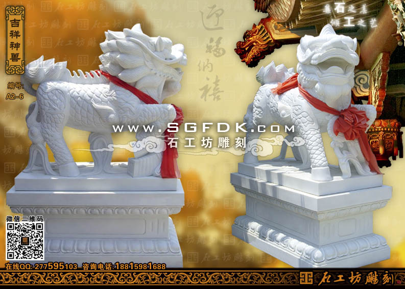 在是上古時期,麒麟便是我們中國人所喜歡的吉祥動物之一,它是勞動人民的一種美好愿望和祈盼,可說說麒麟是人們對追求幸福的一種象征。那時的人們希望麒麟總是伴隨著自己,給自己帶來幸運和光明,而辟除不祥。麒麟每次出現(xiàn)都將是一個非常特別的時期。據(jù)記載,伏羲,舜,孔子等都伴有麒麟出現(xiàn),并帶來神的指示,最終指引勝利。麒麟,亦作“騏麟”,簡稱“麟”,是中國古籍中記載的一種動物,與鳳、龜、龍共稱為“四靈”,是神的坐騎,古人把麒麟當(dāng)作仁獸﹑瑞獸。雄性稱麒,雌性稱麟。麒麟,是按中國人的思維方式復(fù)合構(gòu)思所產(chǎn)生、創(chuàng)造的動物。從其外部形狀上看,麋身,牛尾,馬蹄(史籍中有說為“狼蹄”),魚鱗皮,一角,角端有肉,黃色。麒麟和龍一樣,是中華民族五千年文化的結(jié)晶,是人們對美好生活的一種祈盼。純正漢白玉雕刻的麒麟其色澤雪白,使麒麟更加具有靈性;莅彩し坏窨虒I(yè)的麒麟雕刻加工工廠,我們將致力于為你打造石麒麟中的精品。(資料來源:石工坊雕刻)