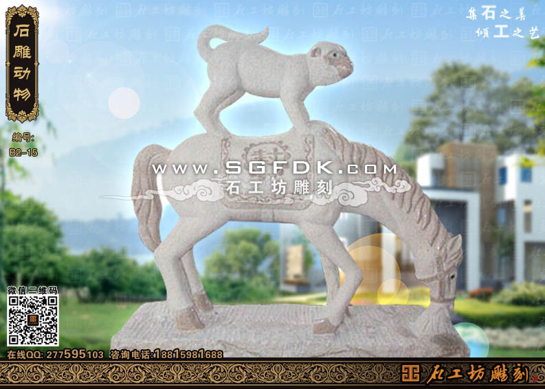 『馬上封侯』的石雕造型,依據(jù)文字進(jìn)行象形化的創(chuàng)造。形狀是一只猴子騎在一匹馬背上,故隱喻為馬上封侯。在中國(guó)的十二生肖里,猴子地支為『申』。取音意引申為『馬上升、馬上封侯』。對(duì)欲求升官發(fā)財(cái)者,可在個(gè)人本命或流年驛馬位擺放,可促進(jìn)早日獲得驛馬星動(dòng),加官進(jìn)爵的功效。