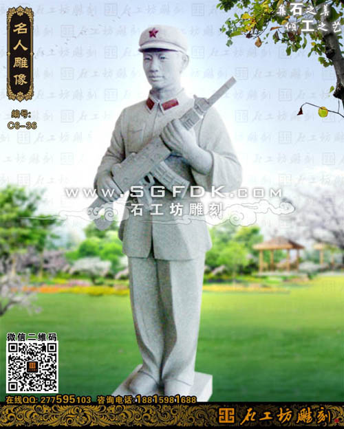 石雕解放軍的雕像根據(jù)仿真人像的雕刻手法,對(duì)解放軍戰(zhàn)士英勇善戰(zhàn)的敢于勝利忠于人民的一面,用藝術(shù)的手法進(jìn)行雕刻和塑造。解放軍的雕像常裝飾于園林景觀、小區(qū)綠化、市政廣場(chǎng)及學(xué)校校園等。不但可以美化空間環(huán)境,更具有愛國(guó)主義教育的現(xiàn)實(shí)意義。